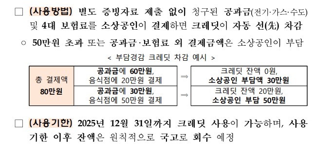 ‘소상공인 부담경감 크레딧kr’은 정부(중소벤처기업부, 소상공인시장진흥공단)가 시행하는 2025년 소상공인 부담 완화 사업입니다.