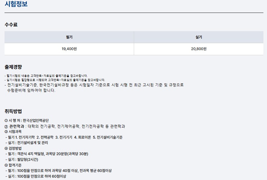 전기기사 시험은 **필기(객관식)**와 **실기(주관식 필답형)**으로 구성됩니다. 두 시험 모두 합격 기준은 60점 이상입니다.